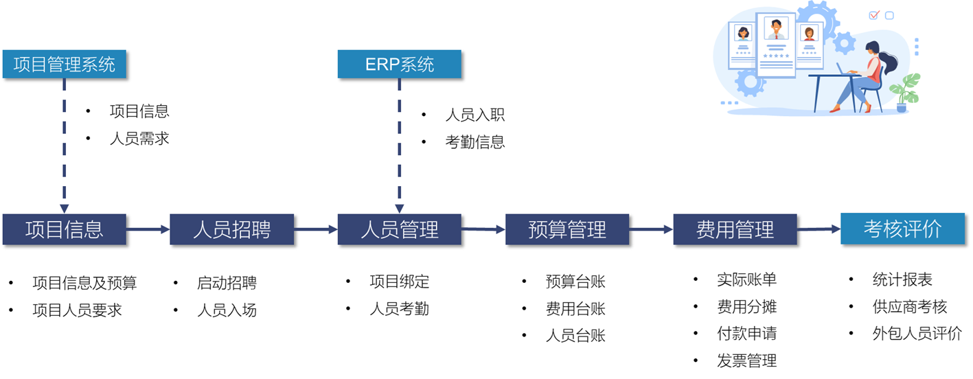 对集团、控股子公司的IT合作方,提供了从立项、招聘、人员管理、费用管理、绩效评估的全生命周期管理