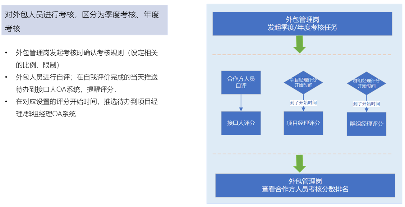 提供健全的外包考核支撑,支持季度考核、年度考核,也支持从自评、项目接口人、项目经理、群组经理的考核评分流程。