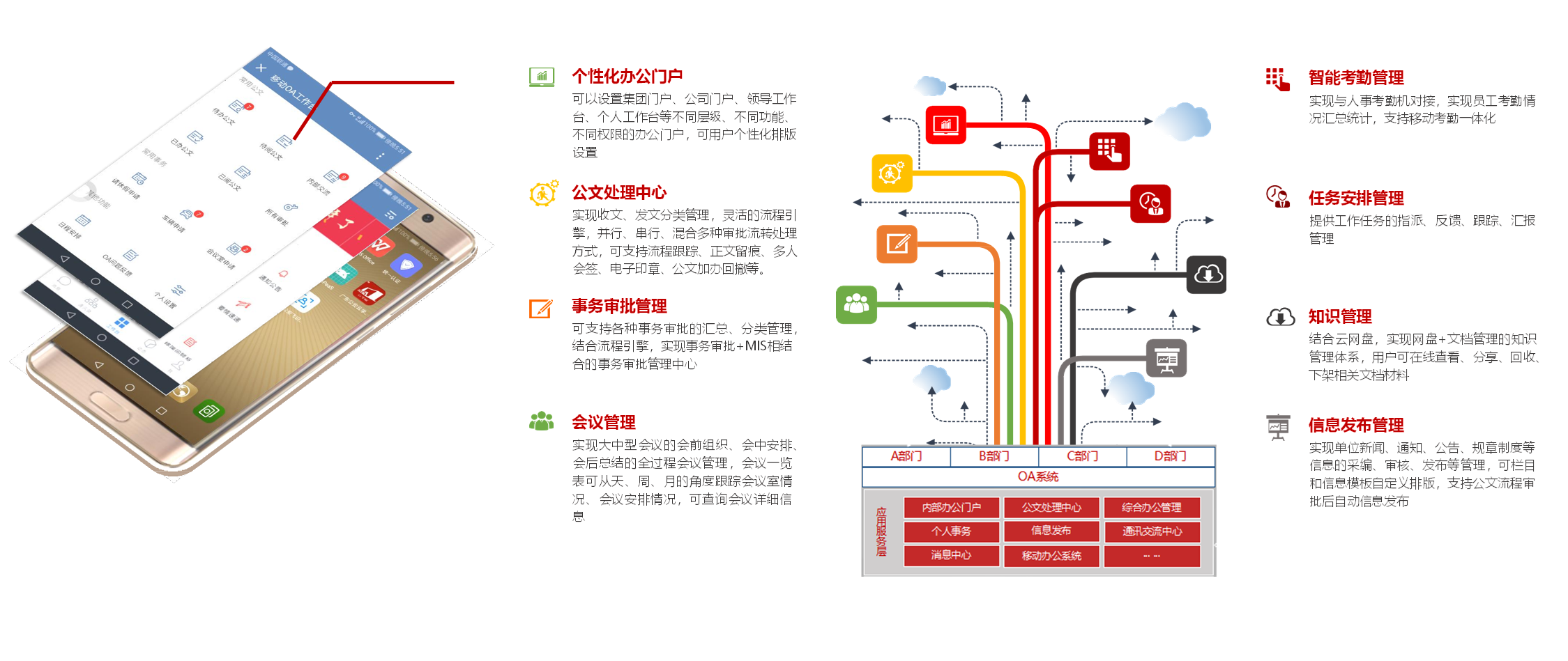 产品功能主要包括即时通讯、日程、内部通讯录、网盘、电子邮件集成、任务管理、视频会议、移动会务、移动审批、统一待办等模块,形成对企业私有移动办公的完整支撑.
